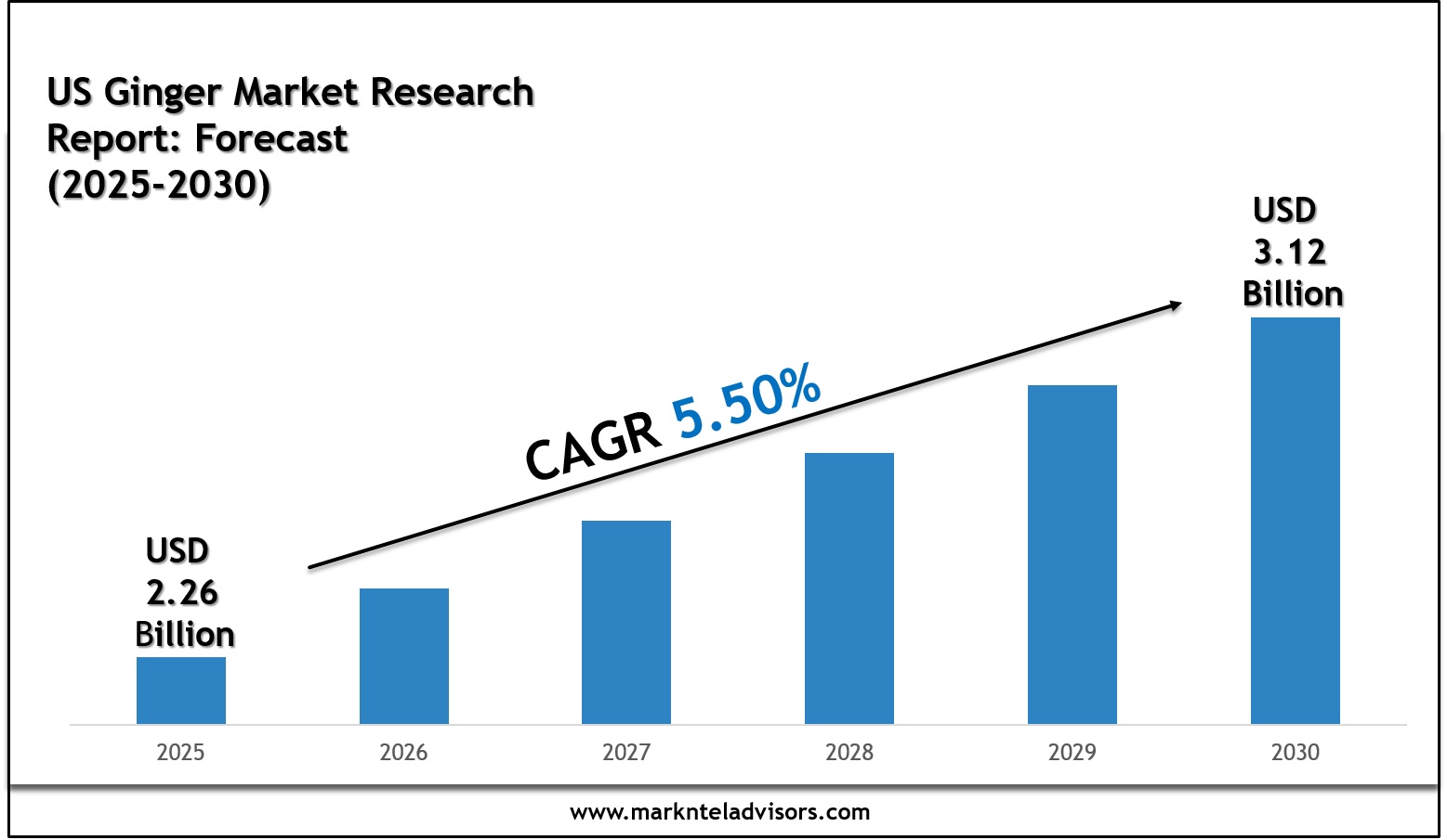 The US Ginger Market size is valued at around USD 2.26 billion in 2025 and is expected to reach USD 3.12 billion by 2030. Along with this, the market is estimated to grow at a CAGR of around 5.50% during the forecast period, i.e., 2025-30. The US Ginger Market is significantly growing due to several growth factors, including the rising culinary tourism in the country, the increasing health consciousness, the widespread acceptance of ginger-based drinks and beverages, the active support by the US government, and the rapid adoption of ginger-based nutraceuticals like supplements, etc.