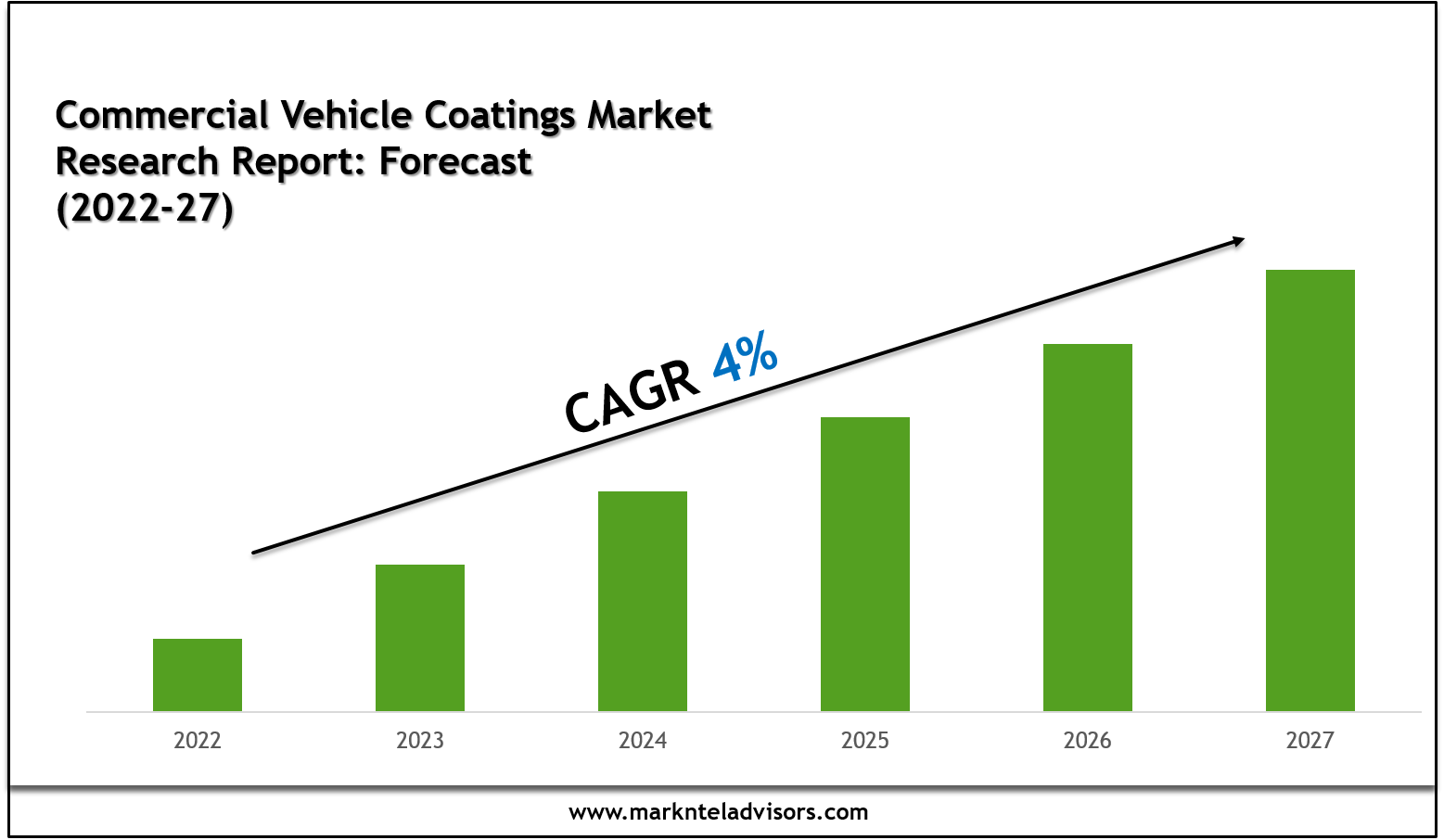 The Global Commercial Vehicle Coatings Market is expected to grow at a CAGR of around 4% during the forecast period, i.e., 2022-27. The growth of the market is driven primarily by the swift expansion of various end-user industries like construction, e-commerce, and transportation & logistics, among others, globally, i.e., leading to the burgeoning production of commercial vehicles and augmenting the demand for paints & coatings for them.